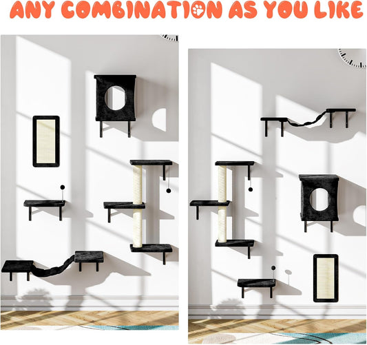 NUNU LAB Wall Mounted Cat Furniture, 7 Pcs Cat Wall Shelves with House, Tunnel, Bridge, Steps, Scratcher, Hammock, Bed, Indoor Safe & Stable Furniture for Kittens Play, Black
