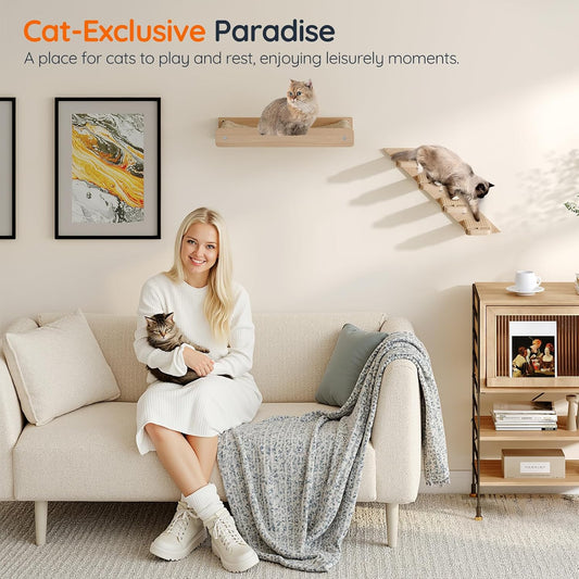2 Set Cat Wall Steps - Wooden Cat Climbing Shelf for Wall - Cats Wall Stairs with Scratching Mat - Wall Mounted Cats Furniture for Jumping, Playing, and Lounging, Walnut