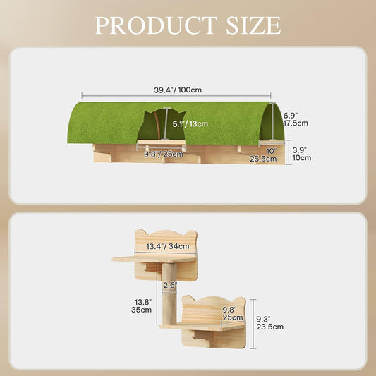 Cat Wall Shelves and Perches, Solid Wood Wall Cat Furniture, Set of 7 Feline Climbing Shelves with Bed, Steps, Scratching Post and Tunnel