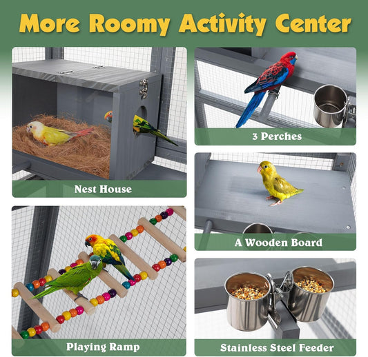GUTINNEEN Large Bird Cage Outdoor Wooden Aviary Indoor on Wheels, with Play Stand, Perches, Nest Habitat & Wire Mesh Tray for Easy Cleaning
