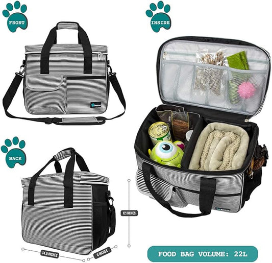 PetAmi Dog Travel Bag - Organizer with Food Container, Bowls & Accessories for Weekend Camping, Cat Diaper Bag (Stripe Black, Large)