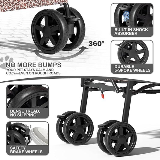 MoNiBloom 4 Wheels Pet Stroller, Easy-Fold Umbrella Shaped Dog Cat Jogger Stroller w/Storage Bag & Visible Mesh for Small/Medium Dogs Cats Leopard Print