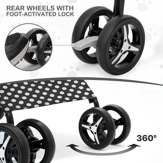 MoNiBloom 4 Wheels Pet Stroller, Easy-Fold Umbrella Shaped Dog Cat Jogger Stroller w/Storage Bag & Visible Mesh for Small/Medium Dogs Cats Black Polka Dots