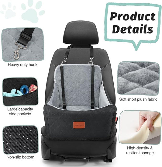 Dog Car Seat for Dogs Up to 35lbs,Fully Detachable and Washable,Memory Foam Covered Soft Fabric,Easy to Install with Adjustable Straps,Anti-Slip Bottom,Two Side Pockets(Black/Grey,Medium)