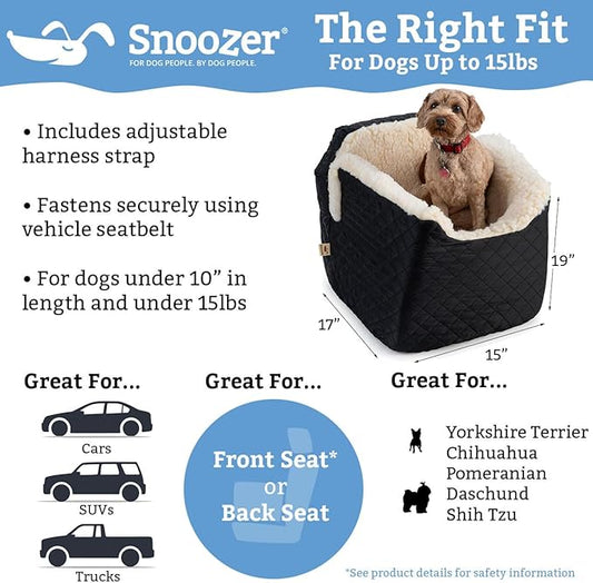Snoozer Lookout I Car Seat - Dog Car Seats for Small Dogs, Puppy Booster Bed for Small Sized Pets up to 18 Lbs, Elevated, Washable - Size S, Black Quilted