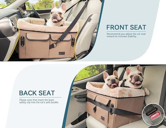 Dog Car Seat for Small/Medium Dogs, Dog Booster Car Seats with Thick Cushion for Dogs Under 35lbs, Detachable Washable Pet Car Seat with Storage Pockets, 2 Safety Belts(Black/Brown)