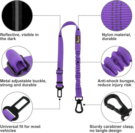 Plutus Pet Dog Seat Belt for Car, Adjustable Dog Car Harness with Carabiner Clip, Reflective Safety Dog Seatbelt Leash with Elastic Bungee, Purple