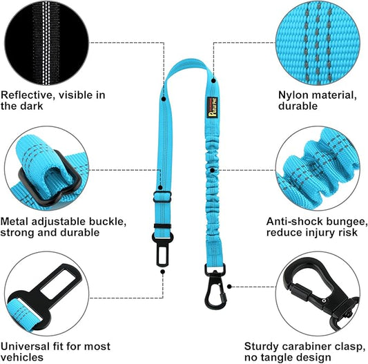 Plutus Pet Dog Seat Belt for Car, Adjustable Dog Car Harness with Carabiner Clip, Reflective Safety Dog Seatbelt Leash with Elastic Bungee, Cyan