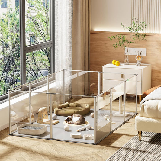 Dog Clear Playpen Fence Kennel: 10Panels Indoor Transparent Whelping Box Pen Cage with Waterproof whelping pad - Extra Long Acrylic Exercise Kennel with Metal Frame for Cats Puppy Rabbits Guinea Pig