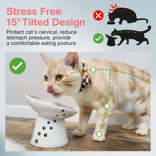 Elevated Cat Bowls, Tilted Rised Cat Food and Water Bowl with 2 Pcs Ceramic Pet Bowls, Rised Stand, Pet Dish Anti Vomiting Feeding Station for All Sized Cats & Small Dogs (White)