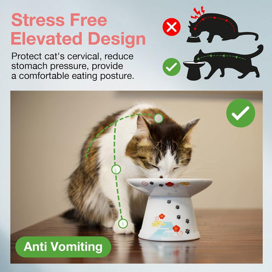 Necoichi Raised Cat Food Bowl – Ceramic Elevated Cat Bowl for Whisker & Neck Fatigue, Dishwasher Microwave Safe – Non-Slip & Anti Vomiting Ergonomic Design (Fuji, Extra Wide)