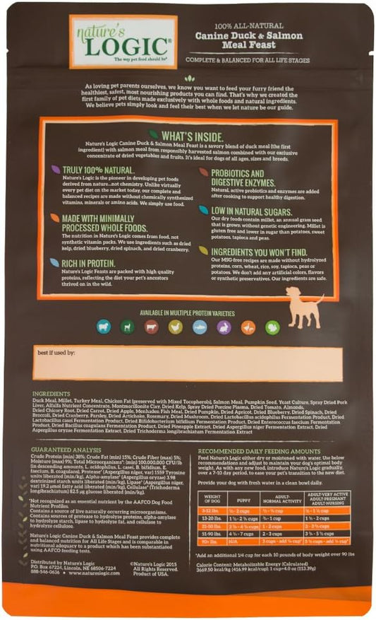 Nature's Logic Dry Dog Food - 100% Natural - No Synthetics - For All Ages, Sizes, Breeds - Free From Common Allergens, High Protein - Duck & Salmon Meal Feast, 4.4lbs
