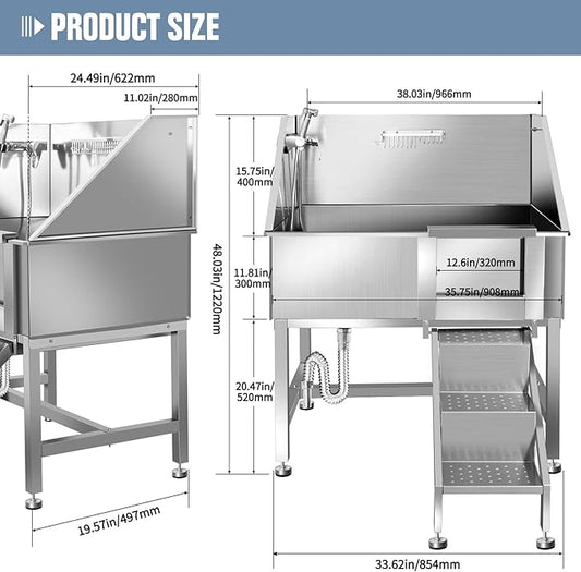 Professional Stainless Steel Dog Grooming Bathtub Station Wash Shower Sink with Faucet Walk-in Ramp and Accessories Pet Grooming Bathtub Station,34" L-RAMP