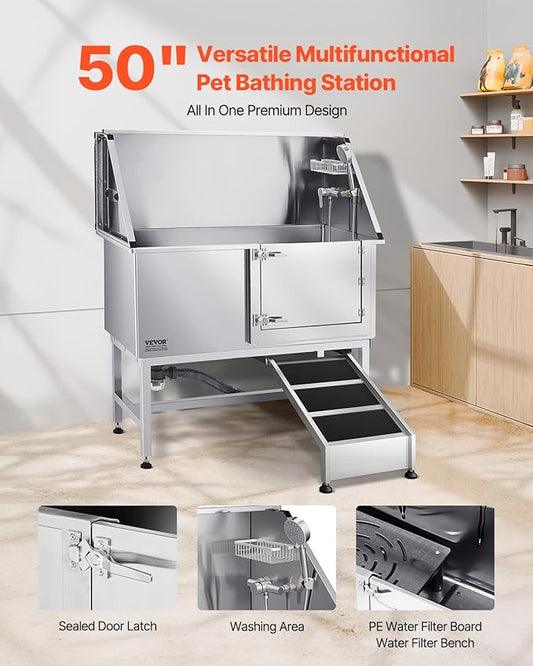 VEVOR Stainless Steel Dog Washing Station, 50 inch Pet Grooming Tub w/Ramp, PE Water Filter Board, Faucet & Showerhead & Soap Holder Dog Bathtub for Large & Medium & Small Pets (Right Door)