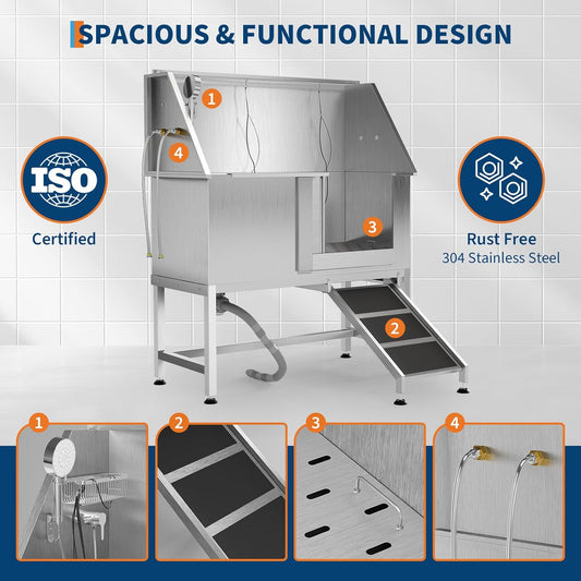 50" Stainless Steel Professional Dog Washing Station - Pet Bathing Tub w/Non-Slip Ramps | Slip-Resistant Floor Grate | for Large/Medium/Small Dogs