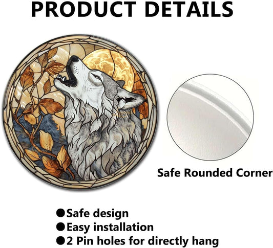 Lygond Metal Sign Tin Sign Circular Stained Glass Gray Wolf Funny Outdoor Decor for Gift 8×8 Inches