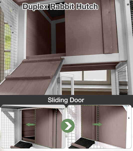76''L Rabbit Hutch Outdoor Indoor with Wheels, Wooden 2 Story Bunny House Rabbit Cage with Run, Waterproof Roof, Pull Out Tray, Guinea Pig Cage Chicken Coop for Small to Medium Pets