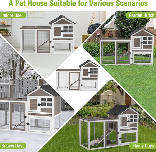GUTINNEEN Rabbit Hutch for Outdoor Indoor Use, Bunny Cage with PVC Layer and Bottom Wire Netting, Wooden Chicken Coop Rabbit House with UV Roof, Leakproof Tray, Run