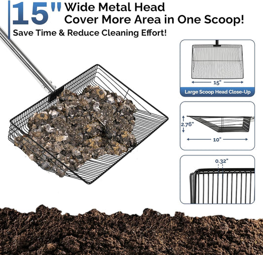 15" Extra-Wide Chicken Poop Scooper – Ergonomic Adjustable Handle (24-70in), Stainless Steel Sifting Shovel Deep Litter Cleaning for Chicken Coops, Goat - Chicken Coop Scoop for Sand, Straw, Hemp