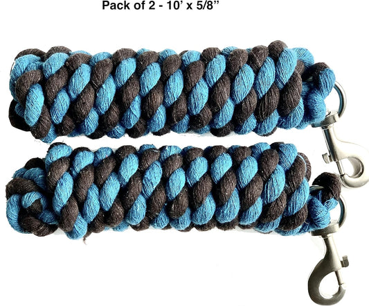 Majestic Ally Pack of 2 Solid Cotton Lead Rope for Horses & Livestock – 10 Foot Long and 5/8 inch Thick - Replaceable Heavy-Duty Satin Bolt Snap – Handmade – Soft, Broken in Feel (Turquoise -Brown)