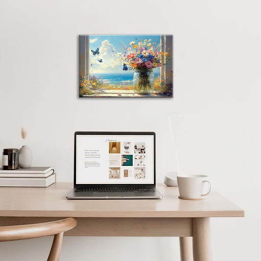 Beach Floral Bathroom Pictures Wall Art, Colorful Flower Bathroom Wall Decor, Coastal Ocean Framed Painting Canvas Artwork for Bedroom Living Room Decorations 24"L x 16"W