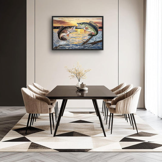 Large Fish Wall Art for Living Room, Framed Bass Fishing Wall Decor, Oversized Rustic Sunset Lake Canvas Painting Fish Pictures Modern Artwork Home Decoration for Living Room Bedroom Office 36"x24"