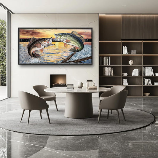 Large Fish Wall Art for Living Room, Framed Bass Fishing Wall Decor, Oversized Rustic Sunset Lake Canvas Painting Fish Pictures Modern Artwork Home Decoration for Living Room Bedroom Office 60"x30"