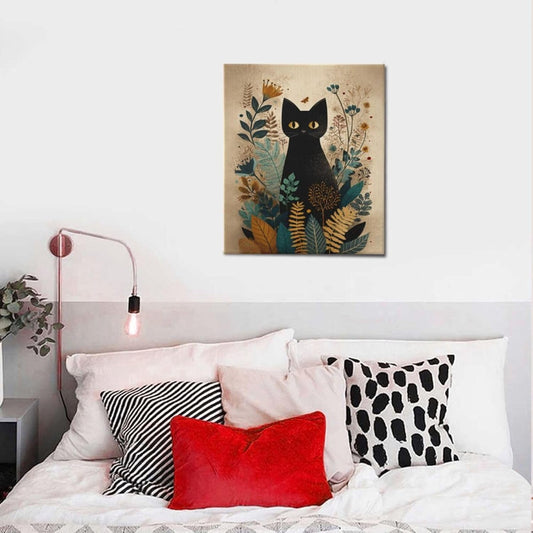 Boho Black Cat Wall Art Kitten Botanical Wall Decor Mid Century Modern Canvas Painting Print Minimalist Pictures Artwork Framed Decorations Gifts for Cat Lover Bathroom Nursery Living Room Bedroom Kitchen 12"x16"