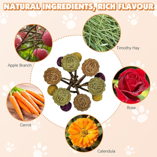 Fhiny Rabbit Chew Toys, 15 PCS Natural Bunny Lollipop Chew Sticks Handmade Guinea Pig Molar Treats for Teeth Small Animals Snacks for Guinea Pig Bunny Chinchilla Hamster Gerbil Teeth Care