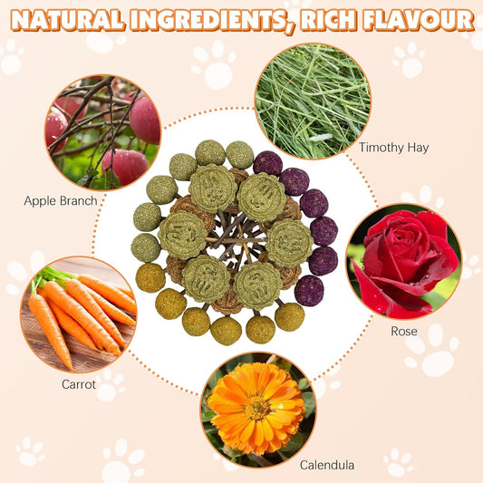 Fhiny 24 PCS Rabbit Chew Toys, Natural Timothy Hay Carrot Biscuit Handmade Bunny Molar Toys for Teeth Small Animal Snacks for Rabbits Guinea Pigs Chinchillas Hamsters Gerbils