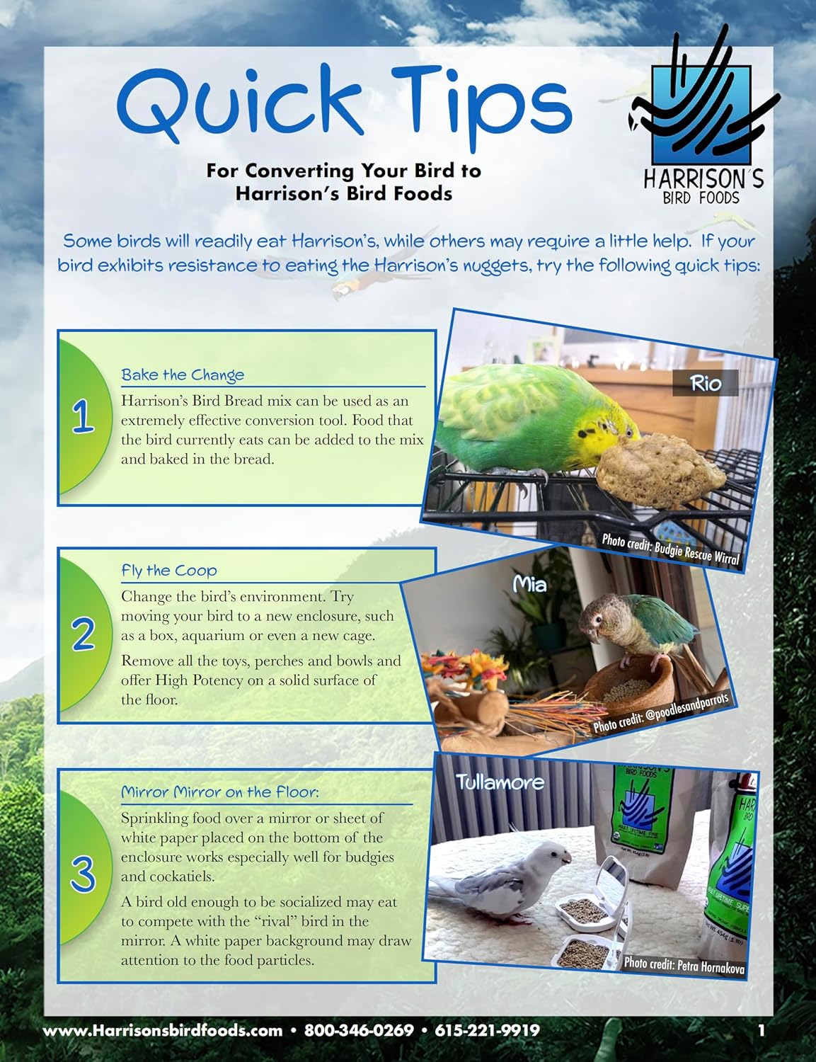 - FOR SMALL BIRDS: Harrison's Bird Foods HIGH POTENCY SUPER FINE, a certified organic, non-GMO formula crafted by avian veterinarians and avian nutritionists for canaries, finches, budgies, parrotlets, cockatiels, lovebirds, and other small birds. It ensures essential nutrition in a nutrient-dense formula for converting to our formula, under 1 year of age, breeding, weaning chicks, recovering from an illness, or molting.
