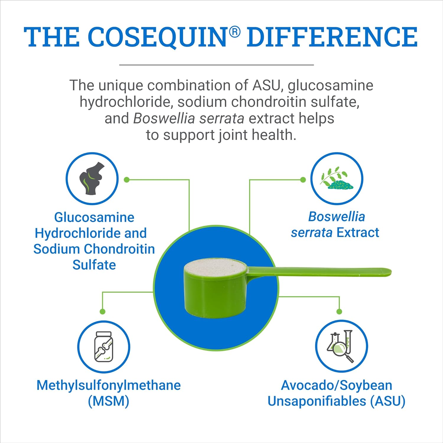 - Powered by ASU: The combination of ASU, glucosamine, and chondroitin found in Cosequin ASU has been shown to be more effective supporting joint health than either glucosamine or chondroitin sulfate alone in cell culture studies