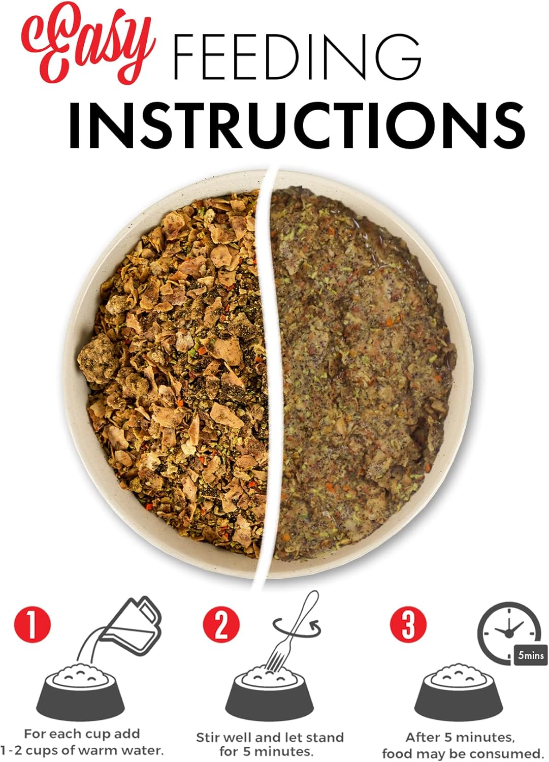 - JUST ADD WATER - For each cup of dog food add 1-2 cups of warm water. Stir well and let stand for 3-5 minutes