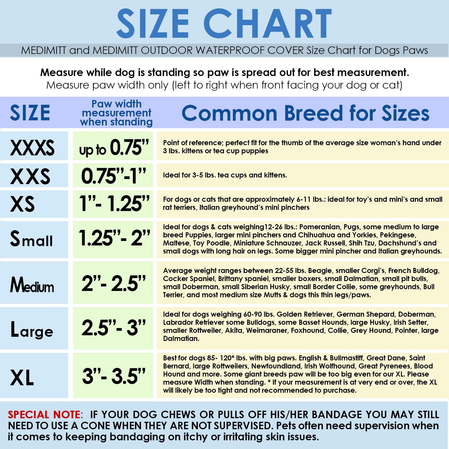 - Size MEDIUM - paw width measurement when standing: between 2-2.50”. Average weight ranges between 22-55 lbs. Beagle, smaller Corgi’s, French Bulldog, Cocker Spaniel, Brittany spaniel, smaller boxers, small Dalmatian, small pit bulls, small Doberman, small Siberian Husky, small Border Collie, some greyhounds, Bull Terrier, and most medium size Mutts & dogs this thin legs/paws. IF YOUR DOG CHEWS OR PULLS OFF HIS/HER BANDAGE YOU MAY STILL NEED TO USE A CONE WHEN THEY ARE NOT SUPERVISED.