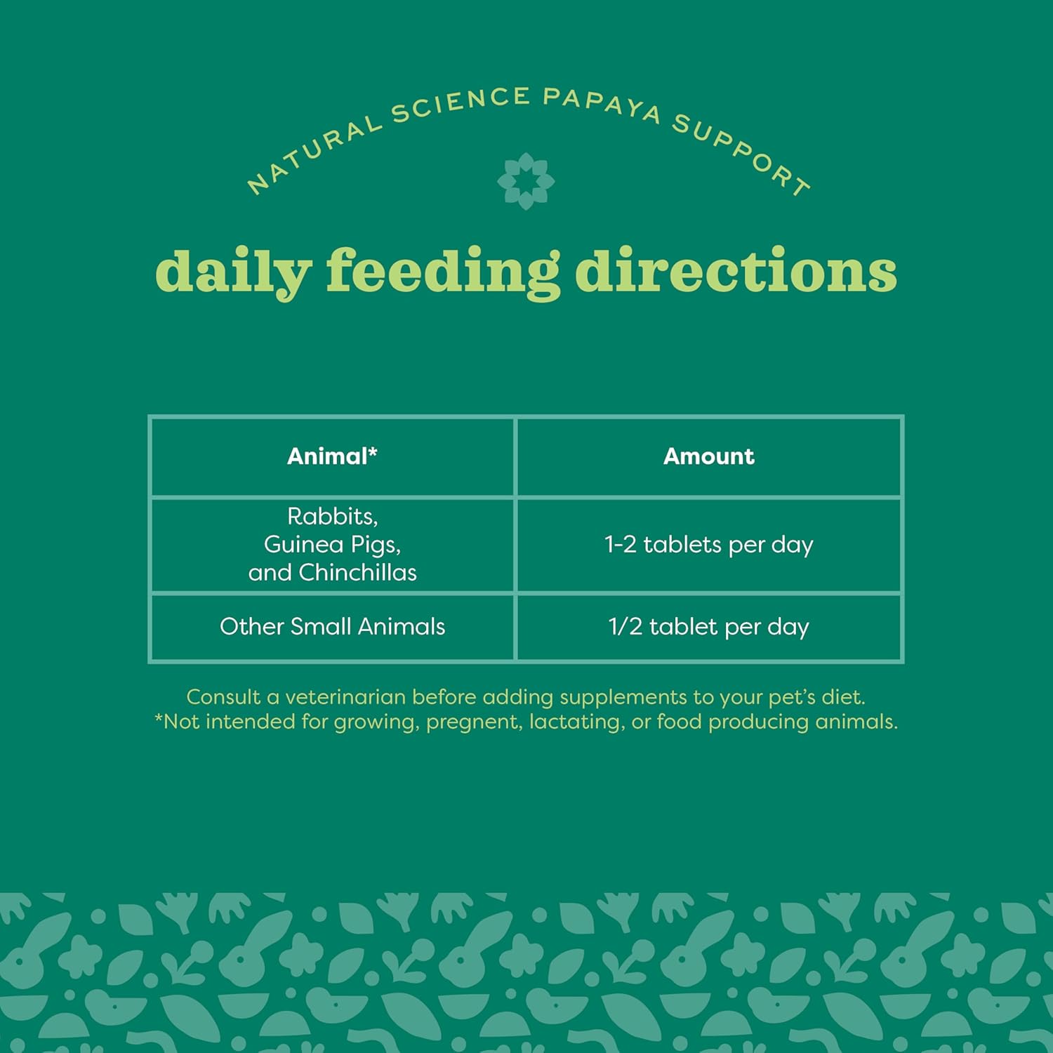 - INSTRUCTIONS: For rabbits, guinea pigs, and chinchillas: feed 1-2 tablets per day. For other small animals: feed 1/2 tablet per day.