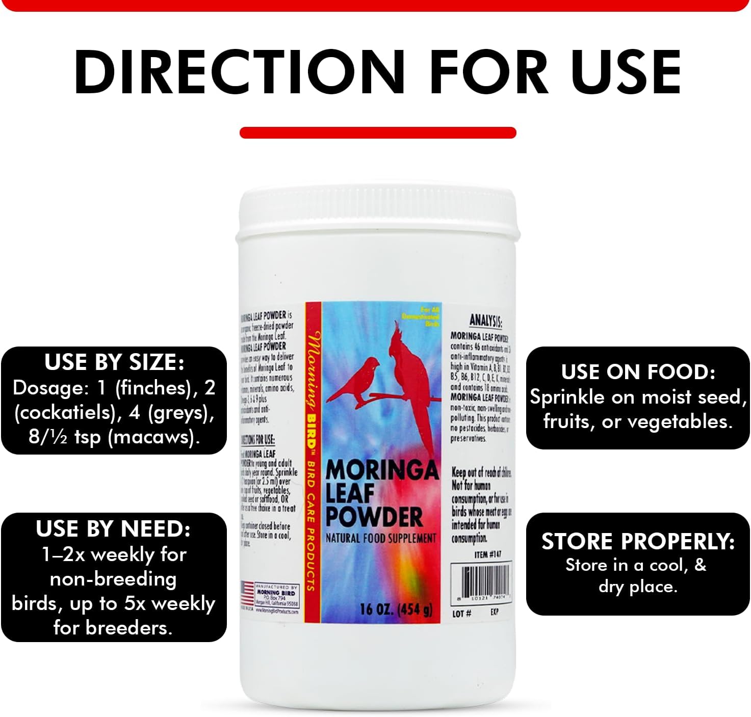 Morning Bird Moringa Leaf Powder 16 Oz – Natural Food Supplement with Omega-3, Iron, Vitamins B & K – Supports Detox, Energy, Brain & Immune Health – Clean Plant-Based Supplement for All Birds
