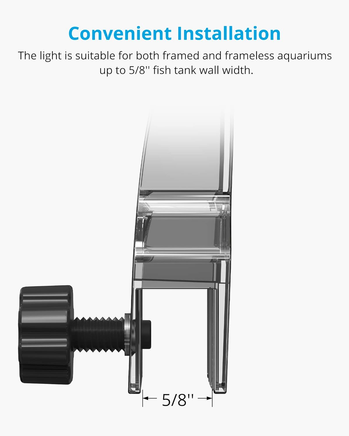- Easily mounts on and secured to the glass of framed or frameless aquariums up to 5/8'' with the clip on bracket design