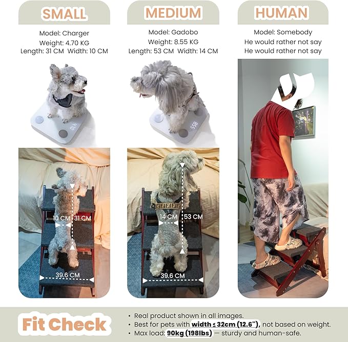 - 5. Size & Weight Capacity Step:15.6" L x 9.3" W x 6.1" H in 4-step full open: 31.5" L x 17.2" W x 25.0" H in. Folded: 39.3" L x 17.2" W x 3.15" in Max load: 100kg / 220lbs. Designed for small and medium dogs and cats with waist width ≤32cm / 12.6in.