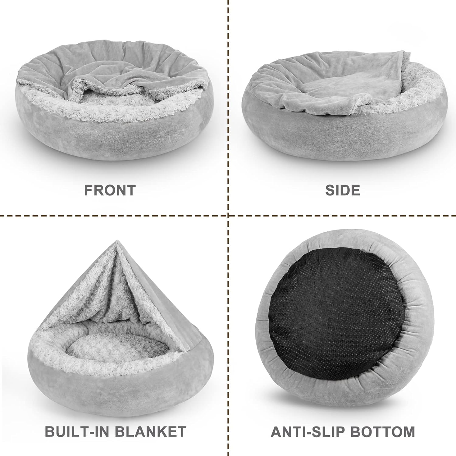 JOEJOY Small Dog Bed Cat Bed with Hooded Blanket, Cozy Cuddler Luxury Puppy Pet Bed, Donut Round Calming Anti-Anxiety Dog Burrow Cave Bed - Anti-Slip Bottom and Machine Washable 23 inch