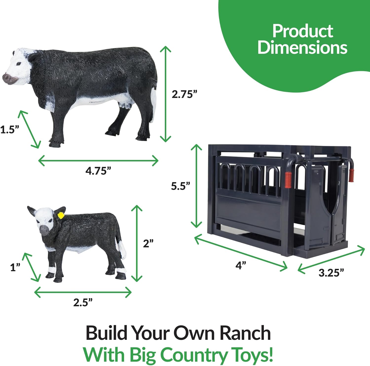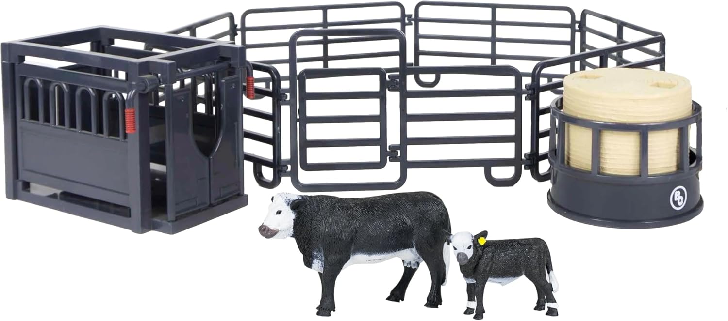 - Durable 12-Piece Farm Playset: Made of our proprietary blend of child-safe plastic that creates durable, lifelike farm animal toys for kids 3-5 years and up. Inside this play figure playset, you'll find farm animal figurines and other accessories like 7-piece corral fencing, a cattle squeeze chute, a toy black baldy cow and calf pair, a toy hay bale, and a toy hay ring.