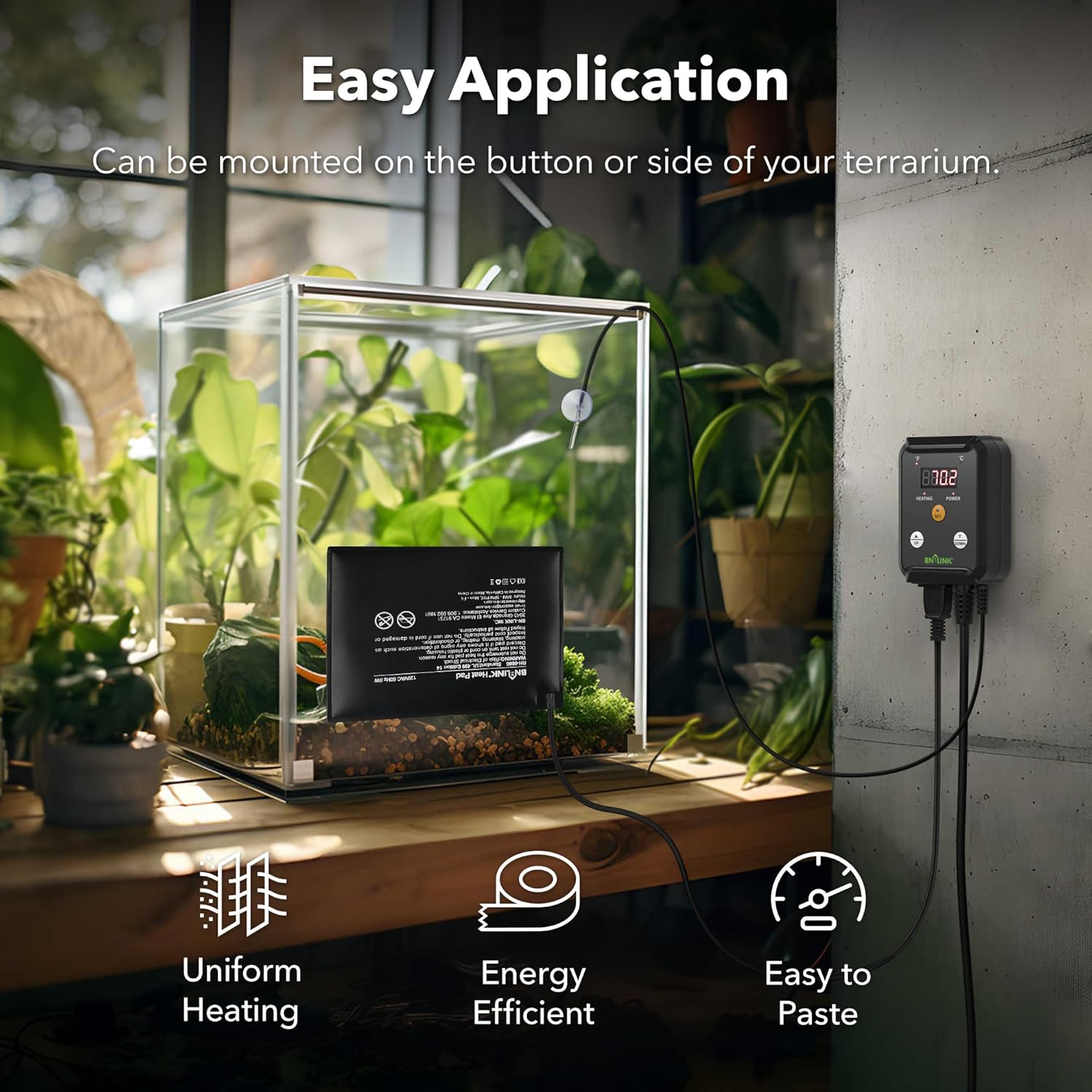 - [CONSISTENT HEATING]: The BN-LINK Durable Reptile Heating Pad provides consistent, uniform heating at temperatures around 104°F to 122°F (40℃ to 50℃), which are the perfect temperatures for reptilian species. Suitable more for 10-25 gal tank.