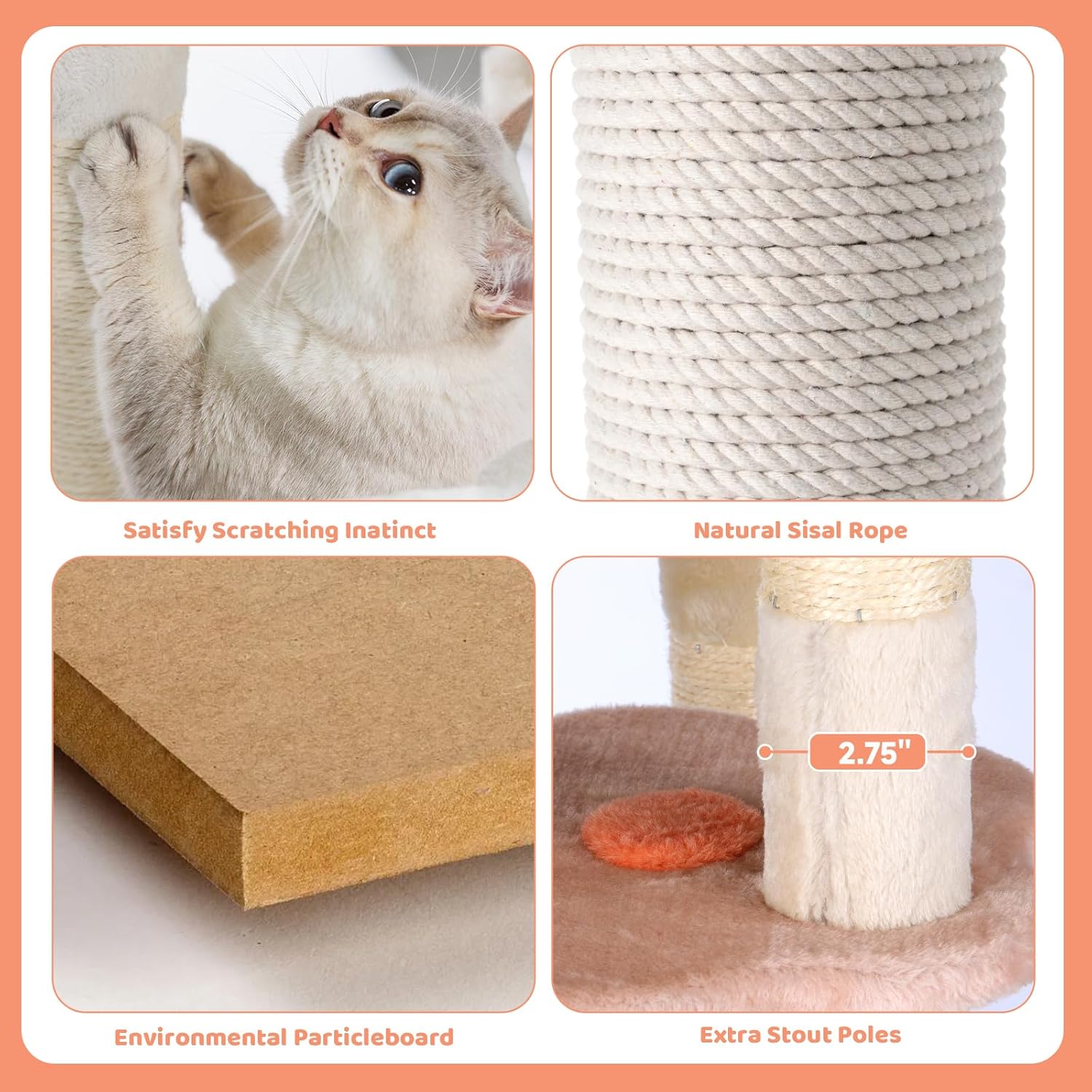 - Premium Eco-Friendly Materials:Made with CARB-certified P2 grade particleboard and 400g skin-friendly plush for comfort. Features 9-core 6mm sisal-wrapped posts, more durable than regular sisal, to satisfy your cat's scratching instincts and protect your furniture. This cat tree is perfect for scratching, climbing, and exercising.