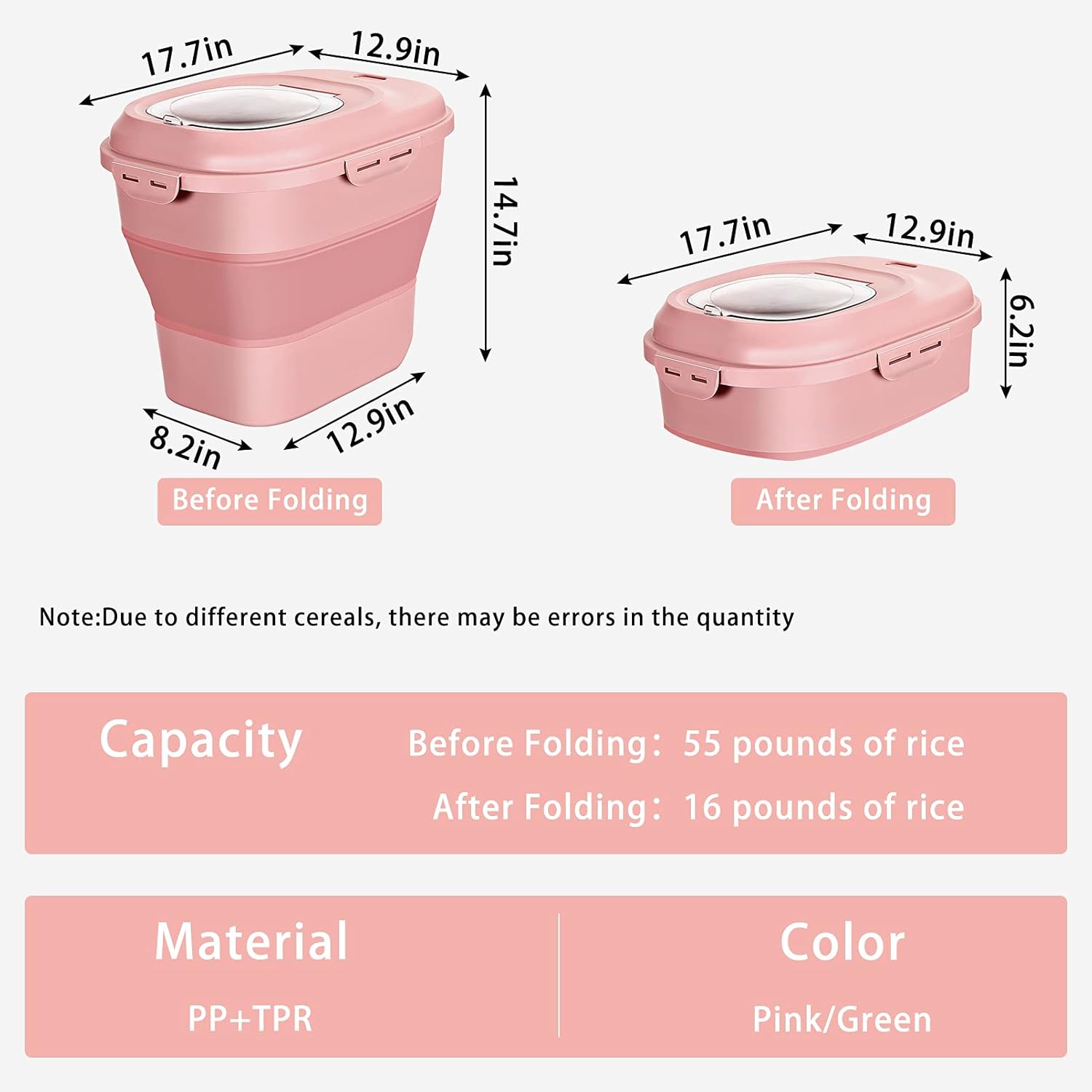 - 🍚【Extra-large & Space Saver】Extra-large food storage container ideal for storing many things.Unfolded size:17.7"L x 12.9"W x 14.7"H, it has a capacity of 25L (23Qt) and can store about 50 lbs of rice or 30 pounds of pet food; Folded size:17.7"L x 12.9"W x 6.2"H , it has a capacity of 6.5L (6Qt) and can store about 20 lbs of rice or 13 pounds of pet food. When you need to put it away, you just need to press it down hard to fold it up to save your space.