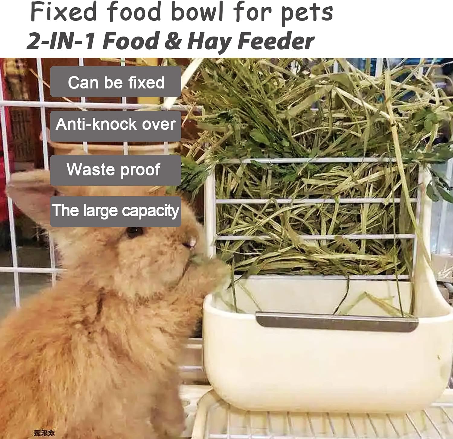 - 【2-IN-1 Food & Hay Feeder】This is a feeder designed for small animals like Guinea Pig, Rabbit, etc.The feeder’s upper layer is a grass rack,and the lower layer is a food bowl. Reduces the forage waste caused by pets feeding and keep the cage in order. White fence in middle separate the forage and grain, which will not cause them to mix. Pets can easily pull hay over the fence while feeding, but it doesn't mess up the cage.