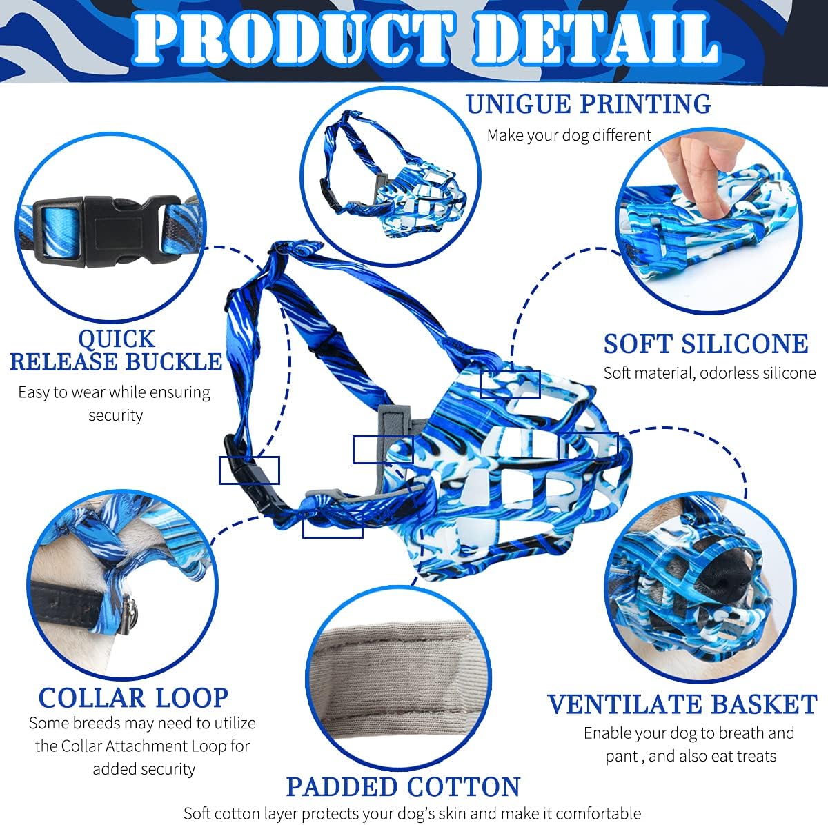 - Soft and Unique: Made of sturdy and safe silicone, it is comfortable for dogs skin and will not rub the dog's nose. There is a neoprene liner at the bottom to increase comfort. With unique printing technology, the appearance is different from the traditional basket dog muzzle, making your dog more attractive on the street