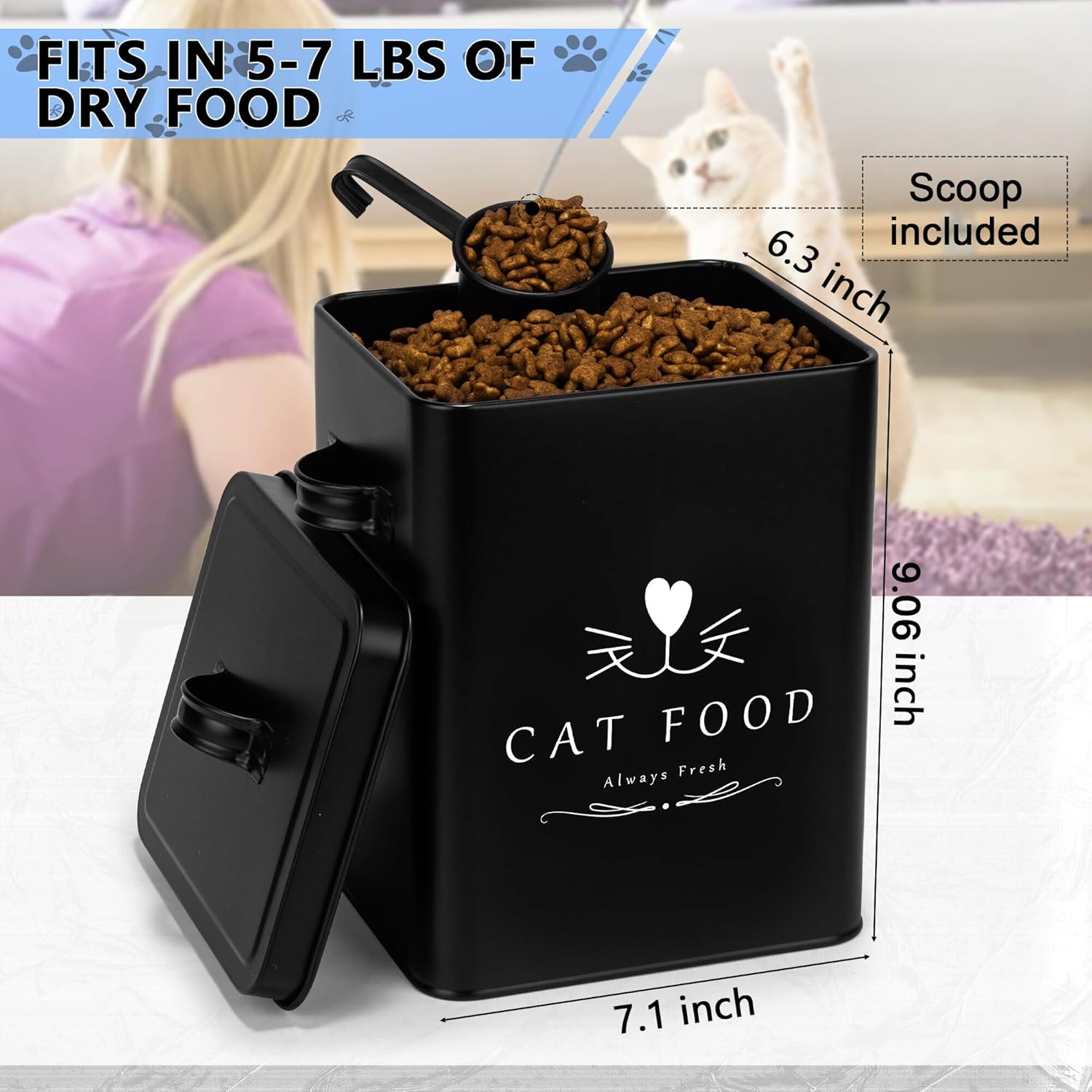 Meraki Home Farmhouse Cat Food and Treats Containers + Feed Scoop + Pet Food Bowl - Tight Lids - Large Metal Storage Bin - Great Gift for Cute Pets (Matte Black)