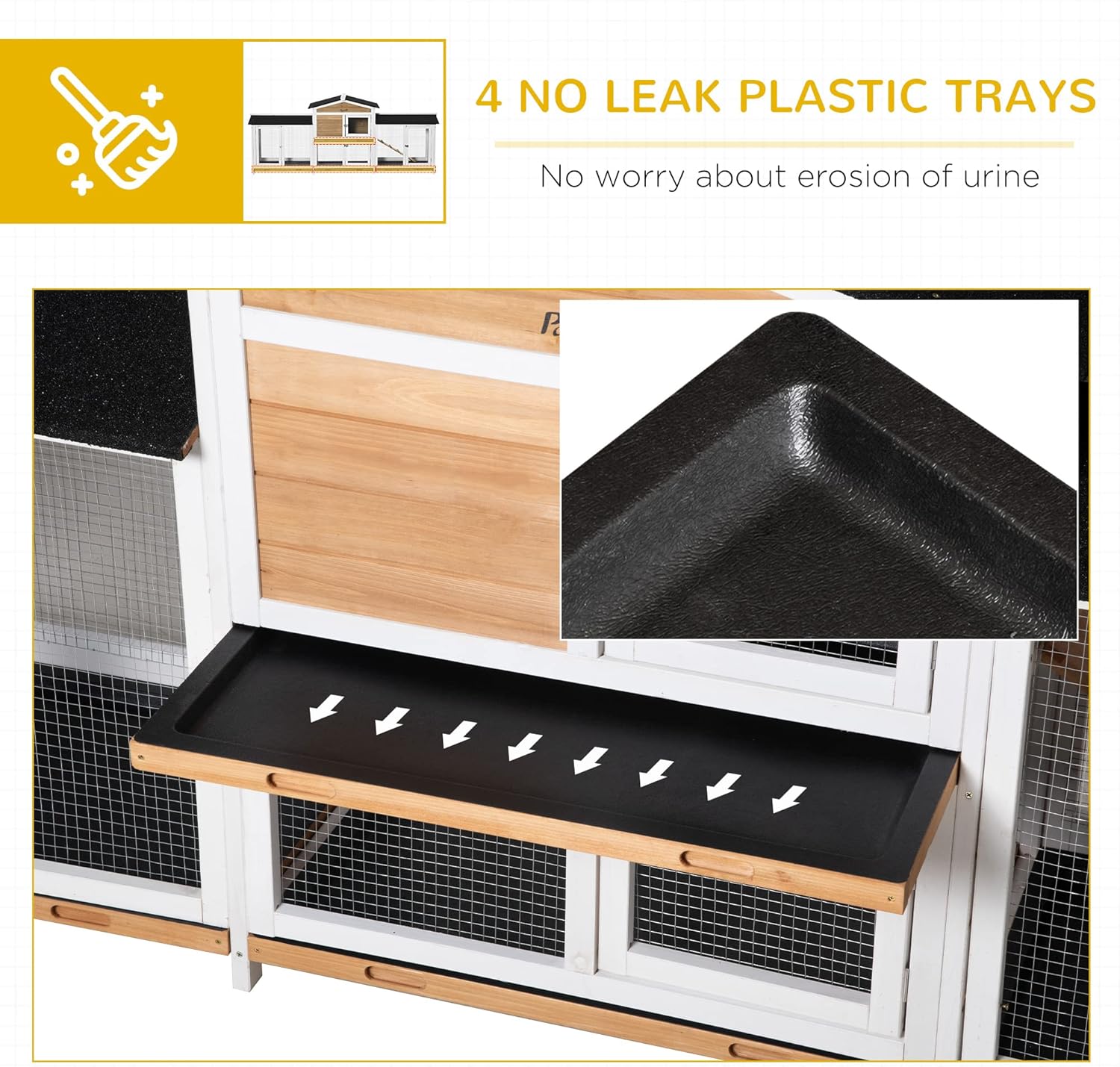 - Easy to Clean: The main house and each run box of this rabbit hutch outdoor have built-in slide-out trays underneath, making cleaning this hutch super-easy.