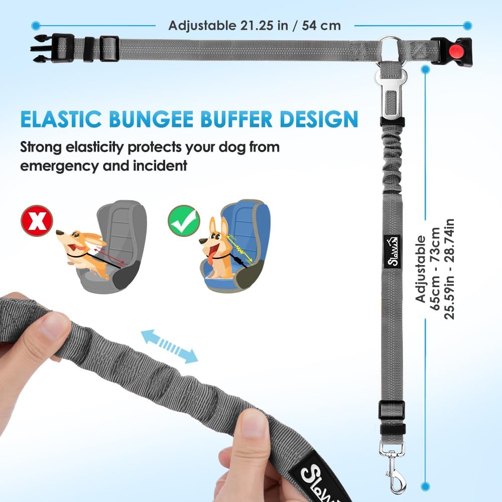SlowTon Dog Seat Belt for Car, 2 Pack Dog Car Harness Seatbelt Adjustable with Elastic Bungee Buffer, 2 in 1 Pet Car Leash Headrest Restraint Dog Reflective Safety Tether (Grey, Headrest+Clip)