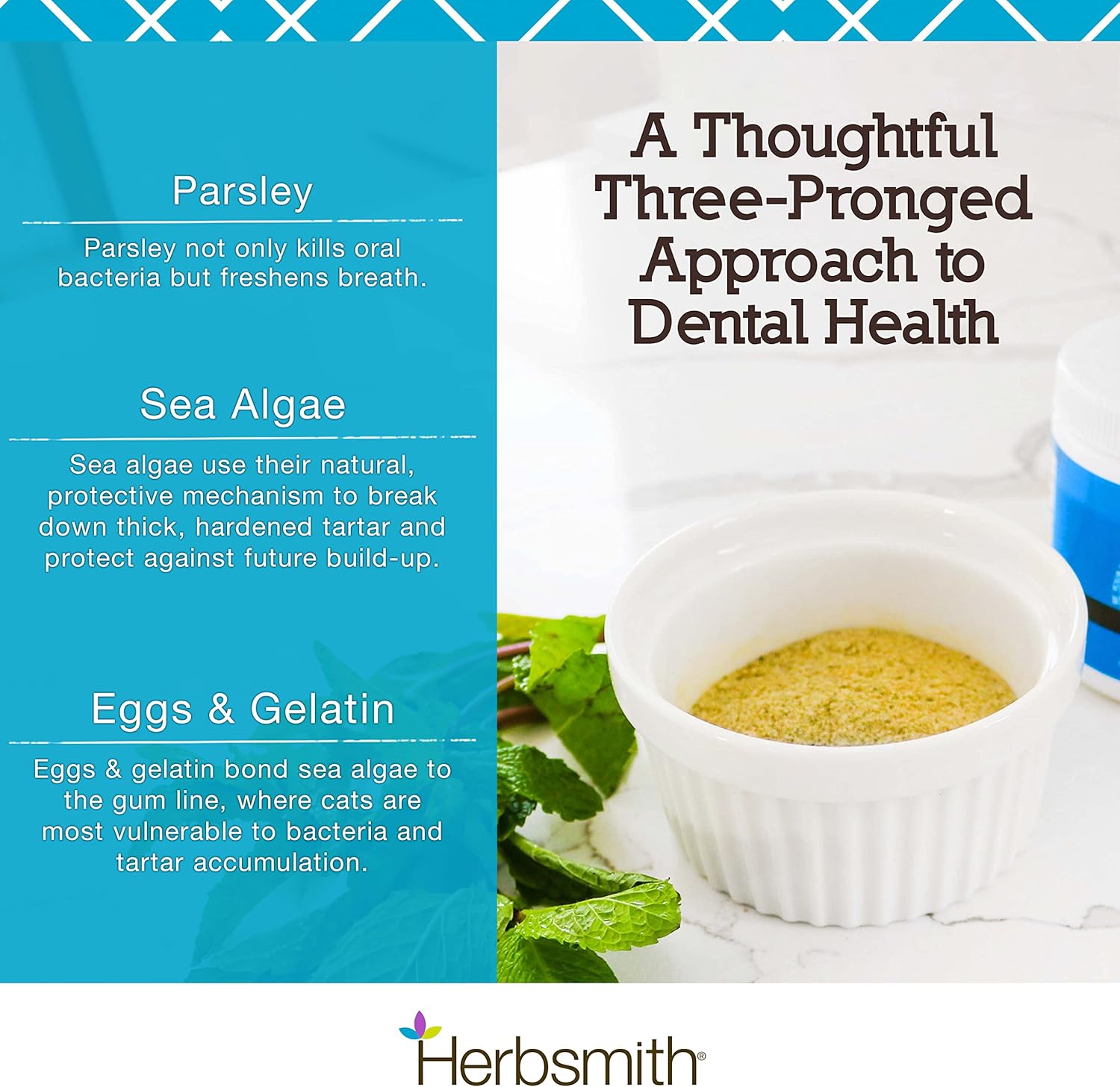 - AN INNOVATIVE THREE-PRONGED APPROACH - Every ingredient was picked with a purpose to target the root causes of tartar and bad breath. Sea algae uses its natural, protective mechanisms to break down thick tartar, while spearmint and parsley use their potent properties to kill the bacteria that leads to bad breath. Binding agents, like eggs & gelatin attach the formula to the gum line, where cats are most vulnerable to bacteria and tartar accumulation.