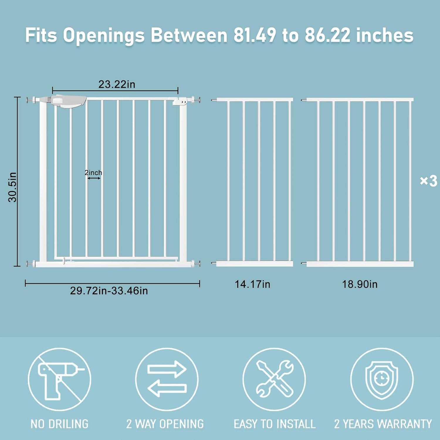 - 【Multi Use】The width of the triple lock extra wide pressure mounted baby gate can be adjusted from 25.59 inches to 81.49 inches so that it is available for stairs, doorways, and other diverse occasions to stop babies or pets to climb over. Tips: before installation, there will be a gap between the wide gate latch and the frame which is NOT a defect and it is NOT bent. This gap will disappear once installed.